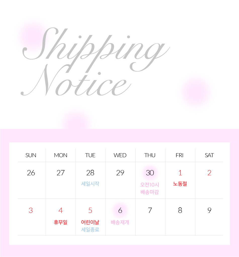 - 5월 1일 ~ 5월 5일 까지 브랜드 휴무로, 4월 30일(목) 오전 10시에 모든 발송이 마감되며, 고객센터 운영이 중단되오니 이용에 참고 부탁드립니다.