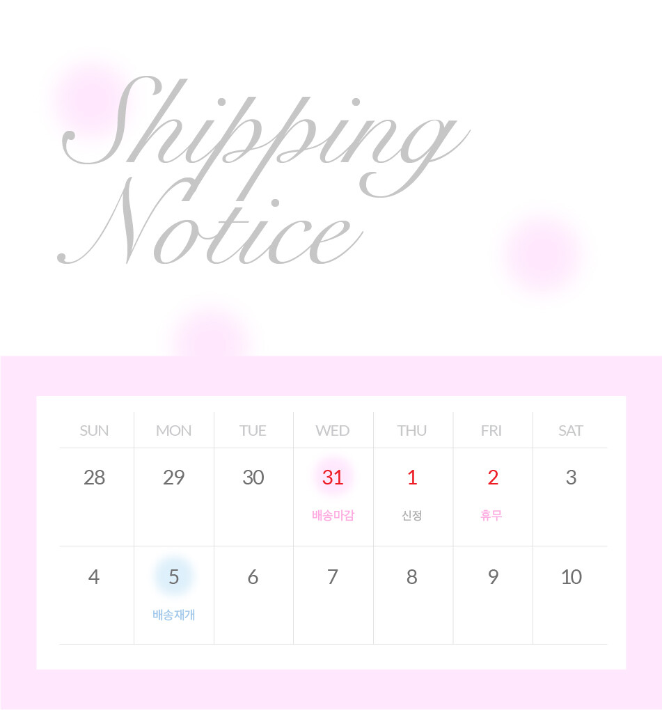 - 1월 1일(목)부터 1월 4일(일)까지 휴무로 인해 12월 31일(수) 오전 11시에 모든 발송이 마감됩니다.